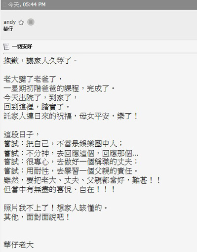 華仔說,“抱歉,讓家人久等了”,“老大(華仔自稱)變了老爸了”,文中感慨他已完成一星期初階爸爸的課程,同時(shí)報(bào)告母女平安。華仔表示,這段日子他試著全心全意當(dāng)個(gè)稱職的丈夫,先不把自己當(dāng)成一個(gè)藝人,雖然要把老大、丈夫、父親都當(dāng)好很難,但他坦言“當(dāng)中有無盡的喜悅、自在”。