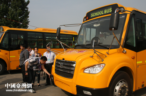 中通客車(chē)生產(chǎn)的校車(chē)得到了記者們的關(guān)注。(中國(guó)臺(tái)灣網(wǎng) 郭瑩瑩 攝)