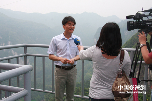 矮寨特大懸索橋設(shè)計(jì)師張永健向臺(tái)媒介紹大橋情況 (中國臺(tái)灣網(wǎng) 張曉靜 攝)