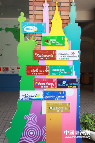 英語村的設(shè)置令人驚艷,當(dāng)學(xué)生步入英語村后,都會因驚艷與她的精致及情境化的主題館,在情意上更加強學(xué)習(xí)的動機,愿意主動學(xué)習(xí)英語。圖為英語村指示牌。(中國臺灣網(wǎng) 李丹 攝)
