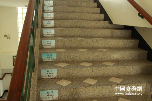 每個(gè)樓梯臺階都有關(guān)于服裝類的中文、英文、閩南語貼畫。(中國臺灣網(wǎng) 李丹 攝)