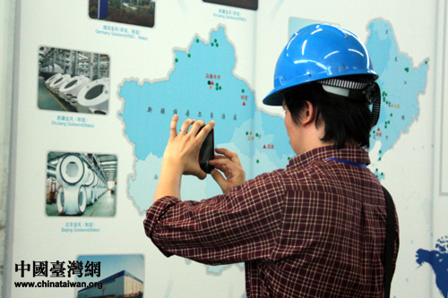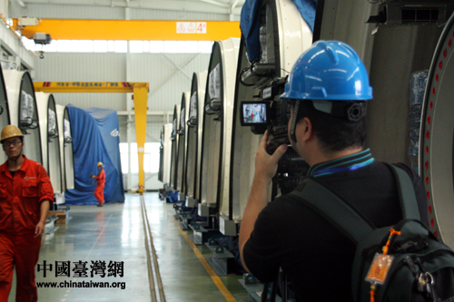 在酒泉新能源裝備制造產(chǎn)業(yè)園區(qū),臺(tái)灣中國電視公司記者方昶懿在新疆金風(fēng)科技股份有限公司參觀風(fēng)機(jī)設(shè)備。(中國臺(tái)灣網(wǎng) 郜利敏 攝)