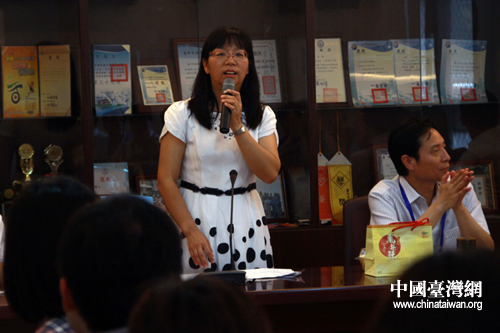 座談會上,臺中市大墩小學校長謝秀娟為大家介紹學校的整體情況、課程設置以及辦學理念。(中國臺灣網(wǎng) 李丹 攝)