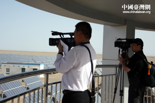 臺灣記者劉文樹和方昶懿在敦煌市太陽能產(chǎn)業(yè)園區(qū)拍攝。(中國臺灣網(wǎng) 郜利敏 攝)