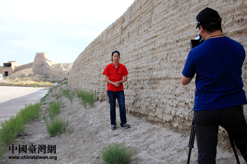 臺灣記者何勁松和方昶懿在嘉峪關(guān)拍攝畫面。(中國臺灣網(wǎng) 郜利敏 攝)