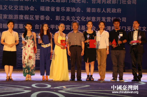 在第三屆海峽兩岸媽祖歌曲青年歌手大獎(jiǎng)賽頒獎(jiǎng)晚會(huì)上,嘉賓向獲獎(jiǎng)選手頒發(fā)獎(jiǎng)杯及獲獎(jiǎng)證書。(中國臺(tái)灣網(wǎng) 張潔 攝)