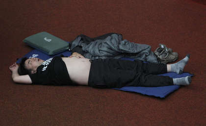 段宜康則自備露營專用的睡墊和枕頭,但熟睡后踢被,還露出一大截肚子,也全被民進黨內(nèi)同志們拍下照片。(中國臺灣網(wǎng) 劉海偉)