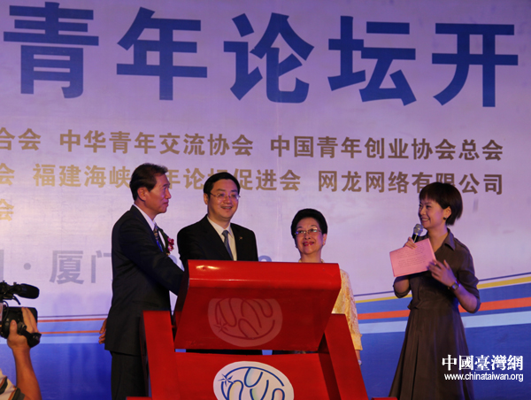 6月15日,團(tuán)中央書(shū)記處常務(wù)書(shū)記、全國(guó)青聯(lián)主席王曉,中華青年交流協(xié)會(huì)創(chuàng)辦人李鐘桂博士和青年創(chuàng)業(yè)協(xié)會(huì)總會(huì)長(zhǎng)、基泰建設(shè)股份有限公司董事長(zhǎng)陳世銘先生共同啟動(dòng)第十屆海峽青年論壇。(中國(guó)臺(tái)灣網(wǎng) 王思羽 攝)
