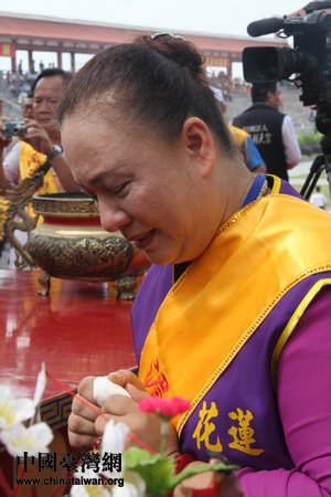 來自花蓮湄清宮的陳玉蘭女士在媽祖金身前流下激動的淚水。(中國臺灣網(wǎng) 郭瑩瑩 攝)