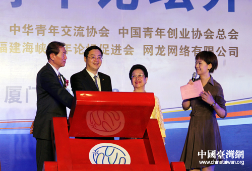 中華全國青年聯(lián)合會主席王曉、中華青年交流協(xié)會創(chuàng)辦人李鐘桂、中國青年創(chuàng)業(yè)協(xié)會總會長陳世銘共同啟動第十屆海峽青年論壇。(中國臺灣網(wǎng) 王思羽 攝)