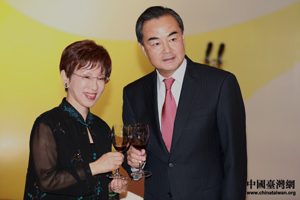 國(guó)臺(tái)辦主任王毅在歡迎晚宴上同中國(guó)國(guó)民黨副主席洪秀柱舉杯致意。 (中國(guó)臺(tái)灣網(wǎng) 王偉 攝)