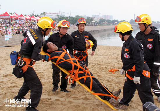救援人員將傷者固定,緊急送醫(yī)。(中國臺(tái)灣網(wǎng) 王思羽 攝)