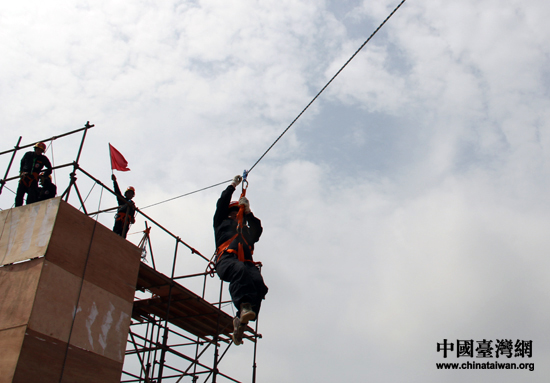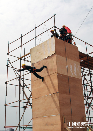 救援隊(duì)執(zhí)行高樓人命救援準(zhǔn)備工作。(中國臺(tái)灣網(wǎng) 王思羽 攝)