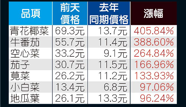 臺北果菜市場前天整體蔬菜批發(fā)價每公斤26元,較去年同期17.4元漲近5成,其中青花椰菜每公斤69.3元、較去年同期漲4倍、空心菜漲2.6倍、小白菜、地瓜葉也漲了近1倍。