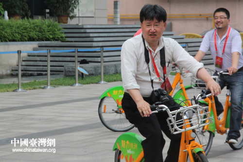 株洲在居民區(qū)、主次干道、交通樞紐、公共場(chǎng)所、公園景區(qū)等地,規(guī)劃建設(shè)502個(gè)公共自行車租賃點(diǎn)。圖為考察團(tuán)成員親自騎車體驗(yàn)。(中國(guó)臺(tái)灣網(wǎng) 王君飛 攝)