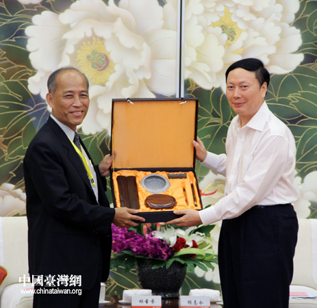 文化部副部長、中華文化聯(lián)誼會顧問楊志今向參加“情系齊魯”活動的臺灣嘉賓團團長林圣芬贈送特色禮品。(中國臺灣網 芮益芳 攝)