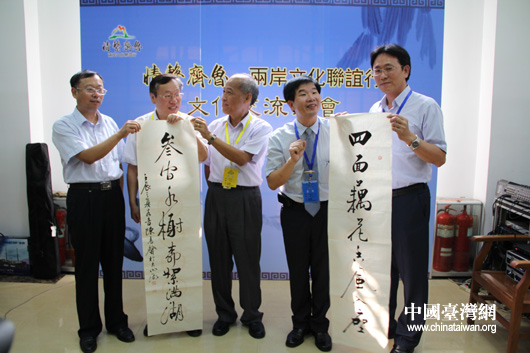 筆會由山東畫院院長孔維克和與“情系齊魯”臺灣嘉賓團團長林圣芬共同主持,山東由孔維克率領四位知名畫家揮毫潑墨,臺灣書畫家由著名書法家、臺中市參事室主任陳志聲與另二位畫家分別筆走丹青。兩岸書畫家不遠千里相聚于此,以筆墨會友,以紙硯敘情。