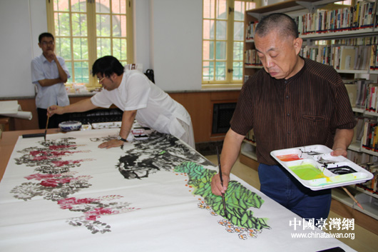 兩岸作家合作一副巨畫,寓意兩岸文化交流開花結(jié)果。(中國臺灣網(wǎng) 芮益芳 攝)
