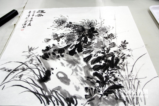 揮毫潑墨臨菊寫(xiě)意,杰作已成供欣賞。(中國(guó)臺(tái)灣網(wǎng) 芮益芳 攝)