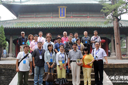 “情系齊魯——兩岸文化聯(lián)誼行”參訪團嘉賓在亞圣殿前合影留念。(中國臺灣網(wǎng) 芮益芳 攝)