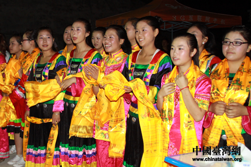 7月5日晚,川臺(tái)兩地學(xué)生在九寨溝縣漳扎小學(xué)舉行篝火晚會(huì)。圖為晚會(huì)開始前,向臺(tái)灣學(xué)生敬獻(xiàn)哈達(dá)。(中國(guó)臺(tái)灣網(wǎng) 王偉 攝)
