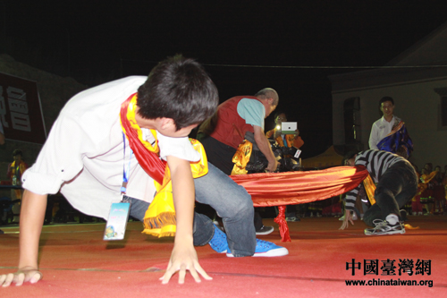 7月5日晚,川臺(tái)兩地學(xué)生在九寨溝縣漳扎小學(xué)舉行篝火晚會(huì)。圖為兩地學(xué)生進(jìn)行圍脖拔河。(中國(guó)臺(tái)灣網(wǎng) 王偉 攝)
