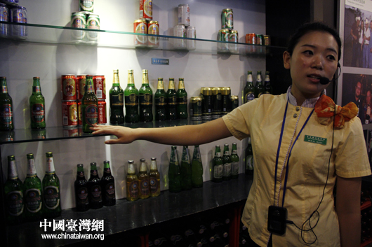“情系齊魯——兩岸文化聯(lián)誼行”參訪嘉賓參觀青島啤酒博物館,講解員介紹青啤種類。(中國臺灣網(wǎng) 芮益芳 攝)