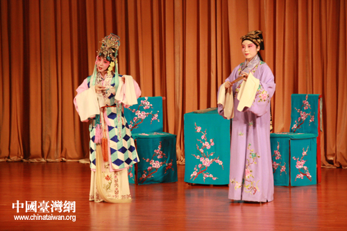 來自臺灣師范大學(xué)昆曲研究社的李念潔(左)與北京師范大學(xué)以雅昆曲社的齊天琪(右)共同表演昆曲《玉簪記·琴挑》。(中國臺灣網(wǎng) 孟雅詩 攝)