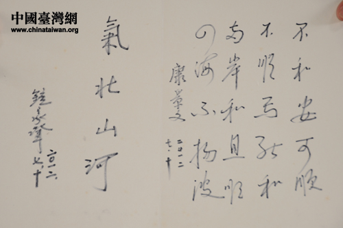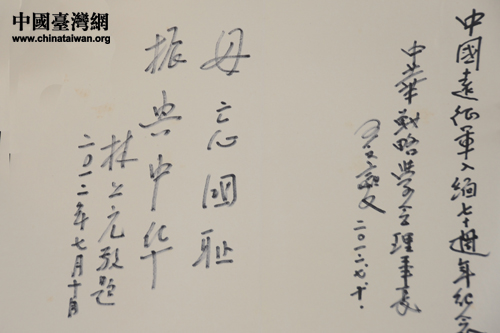 臺(tái)灣退役將領(lǐng)康景文、鐘家聲的題詞(中國(guó)臺(tái)灣網(wǎng)發(fā) 張宏微 攝)