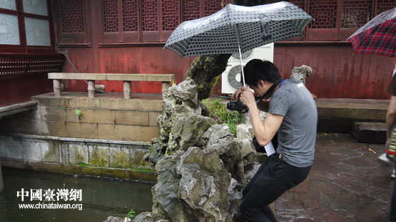 臺灣青年沉醉于拍攝豫園中的古樸建筑。(中國臺灣網(wǎng) 李丹 攝)