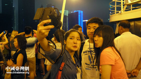 “追尋歷史足跡,傳承中華文化,我們?cè)谏虾!”兩岸青年大學(xué)生夜游黃浦江,齊聲喊口號(hào)。(中國(guó)臺(tái)灣網(wǎng) 李丹 攝)