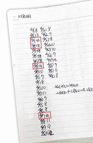 警方查扣少女的筆記本,里面記載接客日期與次數(shù),以今年4月為例,單日接客多達(dá)14人(紅框處)。