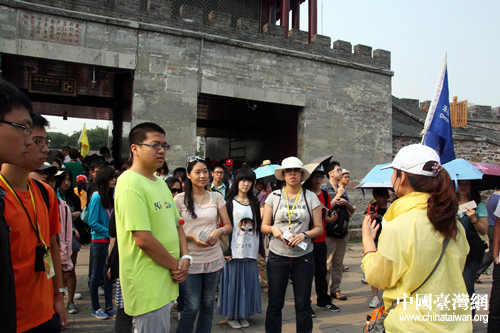 兩岸大學生在承德避暑山莊內(nèi)聽導游講解歷史文化。(中國臺灣網(wǎng) 劉承思 攝)