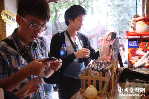 來自臺(tái)灣的裴健淳(左)和張壹翔(右)在南鑼鼓巷挑選禮品。(中國(guó)臺(tái)灣網(wǎng) 孟雅詩 攝)