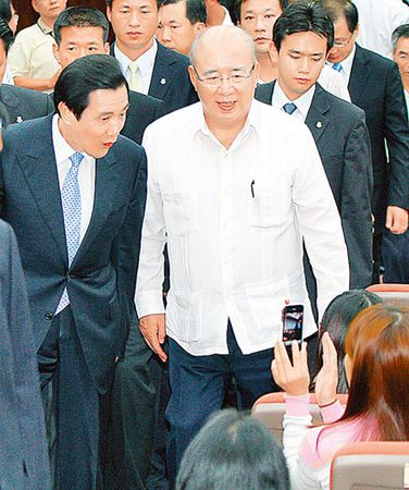 馬英九(左)23日到桃園縣政府,參加吳伯雄(右)父親吳鴻麟獎學金頒獎典禮,離去前有同學在位置上以手機拍照,馬英九露出逗趣的表情。(來源:臺灣《中時電子報》)