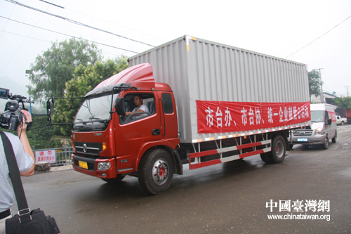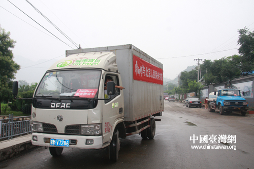 裝載著北京市臺(tái)辦和北京臺(tái)資企業(yè)為災(zāi)區(qū)民眾捐獻(xiàn)的物資“愛(ài)心車(chē)”。(中國(guó)臺(tái)灣網(wǎng) 高斯斯 攝 )