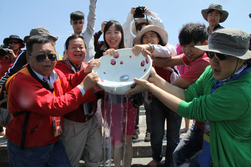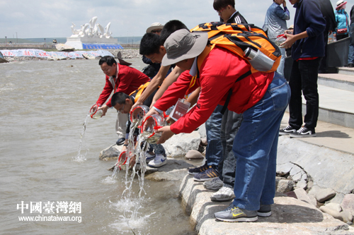 兩岸師生代表將融合完的水緩緩倒入青海湖中(中國臺灣網(wǎng) 趙輝 攝)