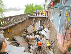 坑人洞 新北市三峽清水街疑地下涵管無法排水,逆流掏空地基,造成路面坍塌5公尺深,造成1人死亡。來源:臺灣《中國時報》