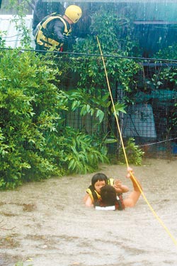 救命索 烏來屈尺的一間河畔民宿遭大水淹至1層樓高,消防隊獲報后到場架設(shè)繩索救援,順利將民眾救出。來源:臺灣《中國時報》