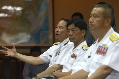 臺(tái)軍海軍司令董翔龍上將(左)6日率領(lǐng)相關(guān)人員出席記者會(huì),說明臺(tái)灣168艦隊(duì)隊(duì)長張鳳強(qiáng)少將逾越操演范圍的經(jīng)過。圖片來源:臺(tái)灣“今日新聞網(wǎng)”