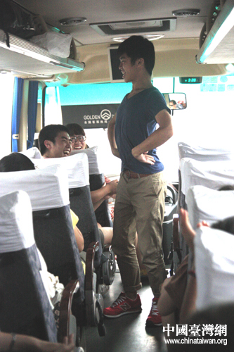 前往蘇州的路上,來自臺北教育大學的陳昱達在車上表演舞蹈。(中國臺灣網(wǎng) 孟雅詩 攝)
