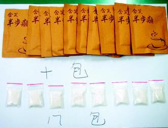 警方表示,“含笑半步癲”是將K粉及搖頭丸混合研磨成粉末,再摻入沖泡咖啡粉,制成速溶包,加入水、飲料、酒類服用后,使用者先會變得很high,接著出現(xiàn)幻想、幻聽,之后會變得癱軟無力。