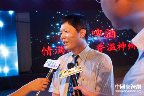 臺灣煙酒公司臺灣啤酒大陸地區(qū)總代理商江新榮董事長接受采訪。(中國臺灣網(wǎng) 吳曉寒 攝)