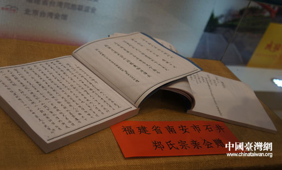 福建省南安市石井鄭氏宗親會(huì)贈(zèng)送展出的鄭氏族譜(中國(guó)臺(tái)灣網(wǎng) 陳寧 攝)