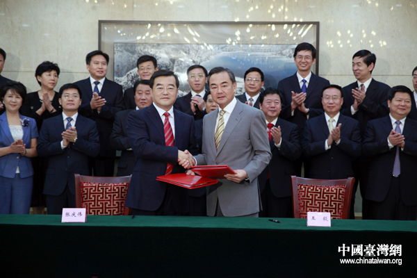 中國(guó)臺(tái)灣網(wǎng)9月4日北京消息 為全面貫徹落實(shí)中央對(duì)臺(tái)工作大政方針和國(guó)家“十二五”京津冀區(qū)域經(jīng)濟(jì)一體化發(fā)展規(guī)劃,推動(dòng)兩岸關(guān)系和平發(fā)展,9月4日上午,國(guó)務(wù)院臺(tái)灣事務(wù)辦公室與河北省人民政府在京簽署了促進(jìn)冀臺(tái)交流合作備忘錄。中共中央臺(tái)辦、國(guó)務(wù)院臺(tái)辦主任王毅和河北省委副書(shū)記、省長(zhǎng)張慶偉共同出席簽字儀式。