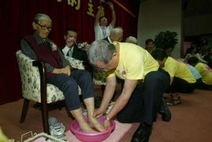 臺“監(jiān)察院長”王建煊(前右)跪地幫高齡94歲母親張瑞華(前左)洗腳。資料照片來源:臺灣媒體