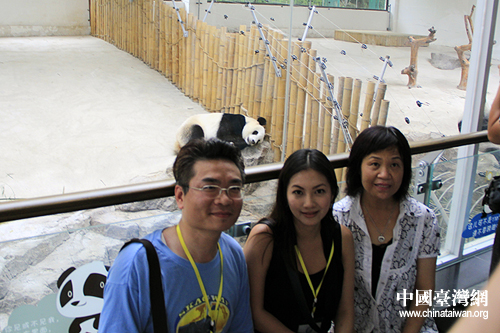在劉公島海峽兩岸交流基地,臺(tái)商們興奮地與大熊貓合影。(中國(guó)臺(tái)灣網(wǎng) 楊麗 攝)