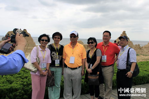 威海風(fēng)光優(yōu)美,圖為海外臺(tái)商在沙雕前合影。(中國(guó)臺(tái)灣網(wǎng) 楊麗 攝)