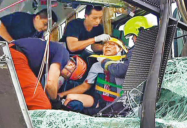 大客車司機(jī)被卡在駕駛座上,表情痛苦,警消人員急忙將司機(jī)救出送醫(yī)。(圖片來自臺(tái)媒)