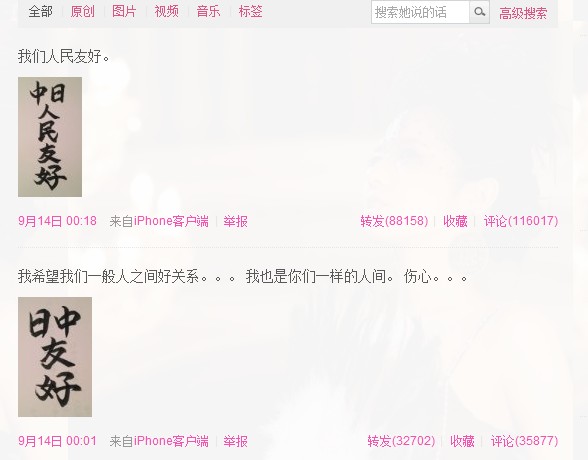 中國臺灣網(wǎng)9月15日消息 據(jù)臺灣媒體報道,日本女藝人蒼井空近幾年進軍中國發(fā)展,也開始學中文,不過面對近日來中日雙方對釣魚島的爭議,蒼井空昨日凌晨在新浪微博,努力用中文寫下“中日人民友好”,引來超過12萬網(wǎng)友留言。